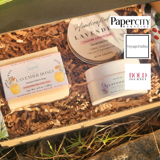 Whipped Tallow Lotion: Lightweight blend of tallow, beeswax, lavender, and vitamin E for deep hydration.