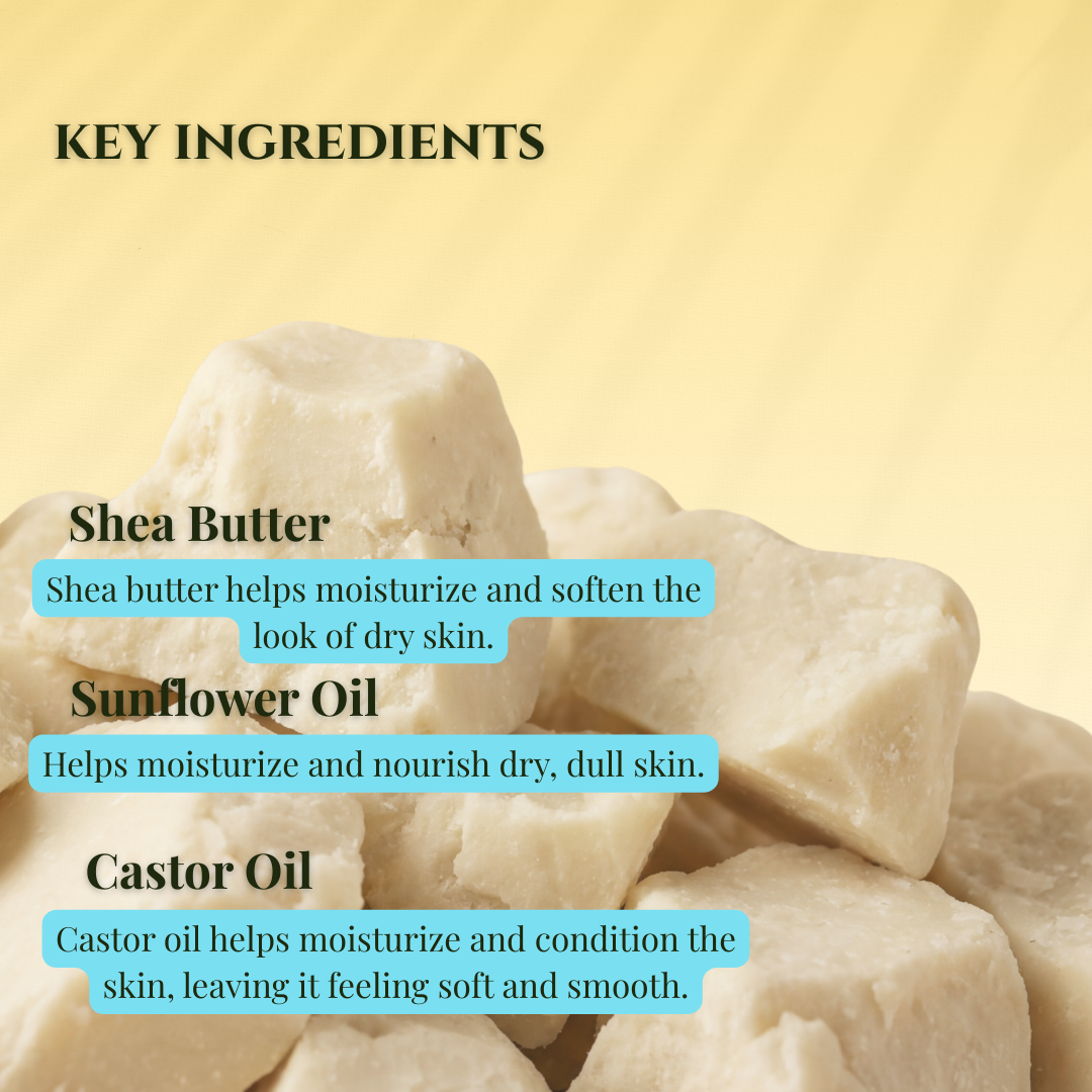 1x 4 oz shea butter soap bar made with shea butter, coconut oil, castor oil, sunflower oil and sustainably grown palm oil